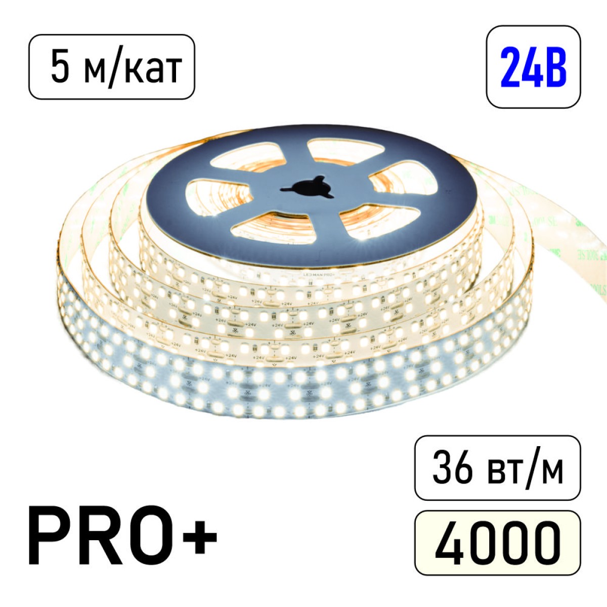 LED MAN, 2835 Лента св/д PRO+, 36вт/м, 400д/м, 24В, 4000K, 3М 9495, 3Oz, 20мм, 5м/кат, Трехрядная
